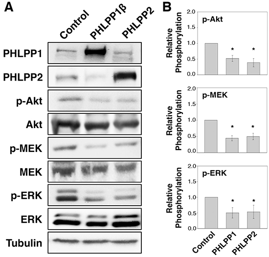 Figure 1: Overexpression of PHLPP isoforms inhibit PI3K/Akt and MEK/ERK signaling. A. Stable control, HA-PHLPP1β or HA-PHLPP2 overexpressing Panc-1 cells were generated using retrovirus-mediated infection. The cell lysates were prepared and analyzed for phosphorylation and total protein expression by immunoblotting. B. Relative phosphorylation for p-Akt, p-MEK, p-ERK were calculated and normalized to those of total Akt, MEK and ERK, respectively. The level in control cells was set to 1. Data represent the mean ± SEM (n = 3, * p<0.05 by two-sample t-tests).
