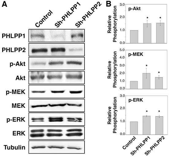 Figure 2: Loss of PHLPP expression enhances PI3K/Akt and MEK/ERK signaling. A. Stable control (sh-Con) and PHLPP knockdown (sh-PHLPP1 and sh-PHLPP2) ASPC-1 cells were generated using lentivirus-mediated RNAi. The cell lysates were analyzed for phosphorylation and total protein expression by immunoblotting. B. Relative phosphorylation for p-Akt, p-MEK, p-ERK were calculated and normalized to those of total Akt, MEK and ERK, respectively. The level in control cells was set to 1. Data represent the mean ± SEM (n = 3, * p<0.05 by two-sample t-tests).