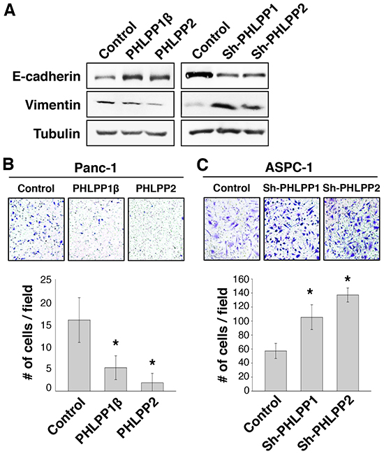Figure 3: Knockdown of PHLPP expression induces EMT and promotes cell migration. A. Cell lysates were prepared from stable control and PHLPP overexpressing Panc-1 as well as PHLPP knockdown ASPC-1 cells. The expression levels of E-cadherin and vimentin were analyzed using immunoblotting. B. Stable control and PHLPP overexpressing Panc-1 cells were subjected to Transwell migration assays using HGF and laminin as chemoattractants. C. Stable control and PHLPP knockdown ASPC-1 cells were subjected to Transwell migration assays using HGF and laminin as chemoattractants. The inserts shown in (B) and (C) were representative images of cells migrated in the Transwell assays. Each experiment was done in duplicates and three independent experiments were averaged and expressed as mean ± SEM (* p<0.05 by two-sample t-tests compared to the control cells).