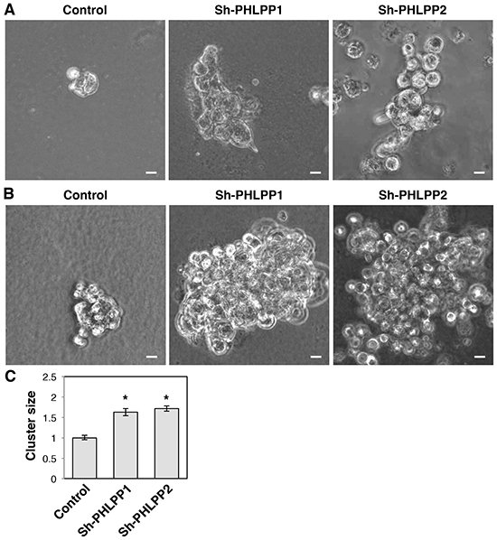 Figure 6: Knockdown of PHLPP promotes the invasive growth of pancreatic cancer cells in 3D culture. A–B. Stable control and PHLPP knockdown ASPC-1 cells were seeded in Matrigel and allowed to grow for 7 days. On the 5th day (A) and the 7th day (B) after seeding phase-contrast images were taken with the 10X objective on using an inverted Nikon microscope. Scale bars, 100 μm. C. The size of cell clusters at day 7 was measured and analyzed using Nikon Element AR software. Data represent mean ± SEM (n = 18 cells/line, * p<0.05 by two-sample t-tests).