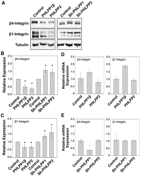 Figure 7: PHLPP regulates integrin protein expression. A. Cell lysates prepared from PHLPP overexpressing Panc-1 and PHLPP knockdown ASPC-1 cells were analyzed for the expression of β1 and β4 integrin and tubulin using immunoblotting. B–C. Relative expression of β1 (B) and β4 integrin (C) was calculated and normalized to tubulin. The level in control cells was set to 1. Data represent the mean ± SEM (n = 3, * p<0.05 by two-sample t-tests). D–E. Total RNAs were isolated from PHLPP overexpressing Panc-1 cells (D) and PHLPP knockdown ASPC-1 cells (E). Real-time PCR analysis was performed using probes specific for human β1 and β4 integrin genes. Each experimental point was done in triplicates, and the graphs represent the mean ± SD (n = 3).