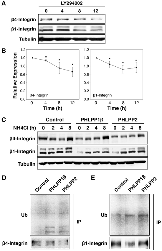 Figure 8: Inhibition of PI3K/Akt pathway promotes lysosome-mediated integrin degradation. A. ASPC-1 cells were incubated with LY294002 for 0–12 hours. At indicated time points, cell lysates were prepared and analyzed for the expression of β1 and β4 integrin and tubulin using immunoblotting. B. Relative expression levels of β1 and β4 integrin at different time points following LY294002 treatment in ASPC-1 cells were calculated and normalized to tubulin. The level in untreated cells was set to 1. Data represent the mean ± SEM (n = 3, * p<0.05 by two-sample t-tests). C. Stable control and PHLPP overexpressing Panc-1 cells were treated with NH4Cl (5 mM) for 2, 4, and 8 hours. Cell lysates were prepared and analyzed by immunoblotting for integrin expression. D. Cell lysates prepared from stable control and PHLPP overexpressing Panc-1 cells were immunoprecipitated with antibodies against β1 or β4 integrin. The ubiquitination of endogenous β1 and β4 integrin was detected using the anti-ubiquitin antibody.