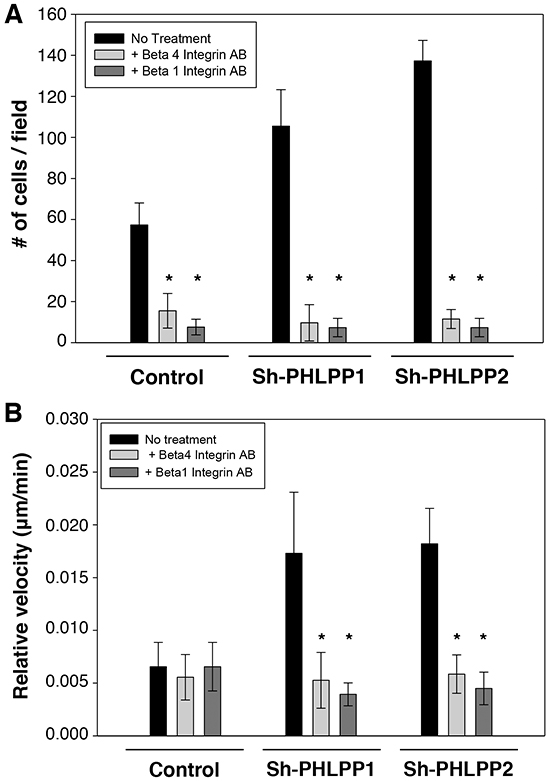 To determine the functional impact of PHLPP-mediated inhibition of integrin expression, we examined the rate of cell migration in control and PHLPP knockdown ASPC-1 cells in the presence of blocking antibodies against β4 or β1 integrin. As shown in Figure 9A, incubating cells with either β4 or β1 integrin blocking antibodies significantly reduced cell migration in both control and PHLPP knockdown cells as measured by Transwell assays. Moreover, inhibiting integrin activation impaired cell motility at the single cell level as the relative velocity in the control and PHLPP knockdown cells became indistinguishable after the blocking antibody treatment (Figure 9B). These data suggested that increased integrin expression in PHLPP knockdown cells is responsible for increased cell migration.