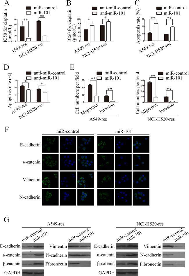 Figure 2: Restoration of miR-101 expression inhibits EMT and promotes the sensitivity of NSCLC cells to cisplatin in vitro. A. The IC50 for cisplatin of A549-res and NCI-H520-res cells transfected with miR-101 mimics was significantly lower than for cells transfected with miR-control. B. The cisplatin IC50 values of A549-res and NCI-H520-res cells transfected with anti-miR-101 mimics were higher than for cells transfected with anti-miR-control. C. The apoptosis rates of A549-res and NCI-H520-res cells transfected with miR-101 mimics were higher than those of cells transfected with miR-control. D. The apoptosis rates of A549-res and NCI-H520-res cells transfected with anti-miR-101 mimics were lower than those of cells transfected with anti-miR-control. E. Transwell migration assays and Matrigel invasion assays showed that restoration of miR-101 expression inhibited migration and invasion abilities of A549-res and NCI-H520-res cells and that anti-miR-101 overexpression promoted those abilities. F. Immunofluorescence assays in A549-res cells revealed that miR-101 overexpression dramatically promoted the expression of epithelial markers (E-cadherin and α-catenin) and dramatically suppressed the expression of mesenchymal markers (vimentin and N-cadherin). G. Western blotting assays showed that restoration of miR-101 expression significantly increased the expressions of epithelial markers and significantly inhibited the expressions of mesenchymal markers.