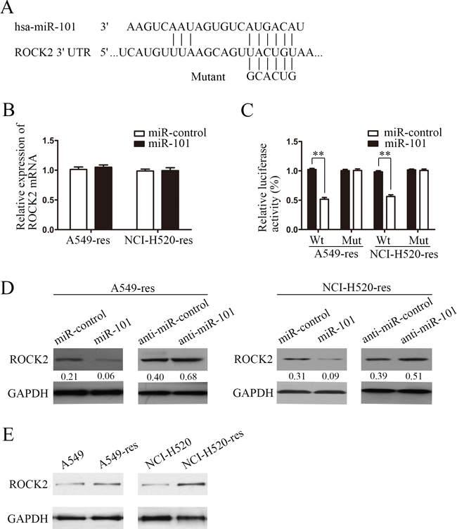 Figure 3: ROCK2 is a direct target of miR-101. A. Schematic of predicted miR-101 binding sequence in ROCK2 3′-UTR. ROCK2 3′-UTR was mutated at the site complementary to the seed region of miR-101, as indicated. Human ROCK2 3′-UTR fragments containing a wild-type or mutant miR-101 binding sequence were cloned downstream of the luciferase reporter gene. B. Real-time PCR of ROCK2 in A549 and NCI-H520 cells transfected with miR-101 mimics or miR-control. Data were normalized to GAPDH mRNA expression. C. Luciferase activity of wild-type (Wt) and mutant (Mut) ROCK2 3′-UTR gene in A549 and NCI-H520 cells transfected with miR-101 mimics or miR-control. D. ROCK2 immunoblotting in A549 and NCI-H520 cells transfected with miR-101 mimics and miR-control or with anti-miR-101 and anti-miR-control. E. ROCK2 immunoblotting in A549-res and NCI-H520-res cells compared with the associated parental lines.