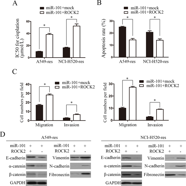 Figure 4: ROCK2 is involved in miR-101-induced EMT and cisplatin resistance. A. The cisplatin IC50 values of A549-res and NCI-H520-res cells co-transfected with miR-101 mimics and ROCK2 were significantly higher than those of cells transfected with miR-101 and mock. B. The apoptosis rates of A549-res and NCI-H520-res cells co-transfected with miR-101 mimics and ROCK were remarkably lower than those of cells transfected with miR-101 and mock. C. Effects of miR-101 mimics on invasion and migration of A549-res and NCI-H520-res cells were rescued by overexpressing ROCK2. D. ROCK2 overexpression reversed the miR-101-mediated inhibition of the expression of epithelial markers (E-cadherin, α-catenin and β-catenin) and the promotion of the expression of mesenchymal markers (vimentin, fibronectin and N-cadherin).
