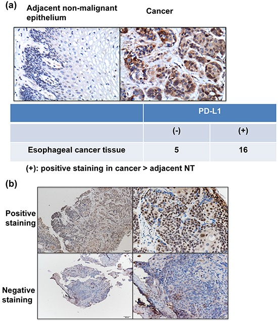 Figure 1: PD-L1 levels in esophageal SCC. a. Representative images of IHC staining with an anti-PD-L1 antibody of esophageal cancer and adjacent non-malignant epithelium from TMA blocks. b. IHC staining with an anti-PD-L1 antibody of human esophageal cancer specimens. Images of representative slides are shown at magnifications of ×100 (left panel) and ×200 (right panel).