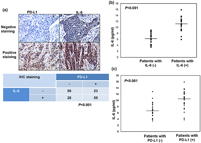 Figure 2: Correlation between PD-L1 and IL-6 levels. a. IL-6 levels correlate positively withPD-L1 levels in human esophageal cancer specimens (p<0.001). Representative images of positive IL-6 and PD-L1 staining on slides from a selected tumor specimen, and representative negative staining for IL-6 andPD-L1 on slides from another tumor specimen, are shown. b. IL-6 levels measured using ELISA in plasma samples obtained from cancer patients with IL-6 negative staining (n = 27) and PD-L1 positive staing (n = 29) disease. The lines indicate the mean values (p<0.001). c. IL-6 levels measured using ELISA in plasma samples obtained from cancer patients with PD-L1 negative staining (n = 25) and PD-L1 positive staing (n = 31) disease. The lines indicate the mean values (p < 0.001).