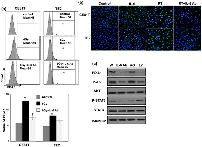 Figure 3: Role of IL-6 signaling on PD-L1 expression in human esophageal cancer. The levels of PD-L1 were evaluated by a. FACS with PD-L1 antibody. Each column is shown as the means of 3 separate experiments; bars, SD.*, P<0.05; and b. IF staining for human esophageal cancer cells at 48h after IL-6 regulation in vitro (Blue, DAPI; Green, PD-L1). c. Effect of inhibited IL-6 signaling on PD-L1 protein levels as determined by immunoblotting (W, proteins were extracted from cells under control condition; IL-6Ab, proteins were extracted from cells incubated in the presence of 5 μg/ml IL-6 neutralizing antibodies for 48h; AG, proteins were extracted from cells incubated in the presence of 50 μM AG490 for 48 h; LY, proteins were extracted from cells incubated in the presence of 50 μM LY294002 for 48h).