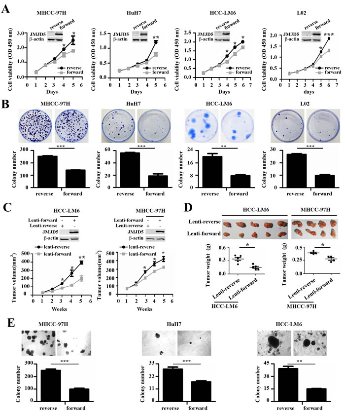 Figure 4: The anti-proliferative role of JMJD5 in HCC cells. A.-B. The proliferation of four hepatic cell lines transfected with plasmids expressing JMJD5 (forward) was evaluated. A. Cell viability was calculated every day for 5 or 6 days to determine the cell growth curve. A plasmid containing the reverse JMJD5 sequence was used as a control, and JMJD5 protein expression, as indicated by western blot, is shown at the top. B. Plate colony formation is shown with representative dishes (top) and the number of colonies was statistically analyzed (bottom). C.-D. In vivo tumorigenicity of MHCC-97H and HCC-LM6 HCC cells stably expressing JMJD5. C. Tumor volumes were measured at the indicated time points. The JMJD5 expression level in these cells is indicated at the top. Each group contained four or five mice. D. Tumors were removed (upper), weighed, and then statistically analyzed (lower). E. Three HCC cell lines were transfected with JMJD5, and colony formation in soft agar medium was analyzed. All experiments were repeated at least three times. *, P < 0.05; **, P < 0.01; ***, P < 0.001.