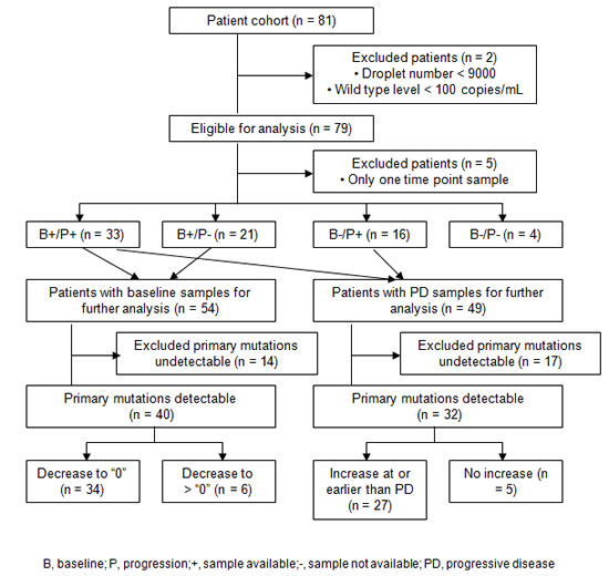 The circulating tumor DNA in plasma with its non-invasive technology has been used as a surrogate for tumor tissues in detecting genetic alterations, thus providing molecular evolution of the tumors [14-17]. Bai et al. showed the difference in response rates (59.5% and 23.1%, P = 0.002) for gefitinib between patients with and without activating EGFR mutation in plasma [18]. Recently, droplet digital polymerase chain reaction (ddPCR), a highly sensitive technology has been developed for detecting low frequency cancer-associated mutations [19]. We hypothesized that plasma-based EGFR mutation analysis using ddPCR may be feasible in monitoring response and resistance to EGFR TKIs. Therefore, we conducted a multi-center prospective study to assess dynamic changes in EGFR mutation profile using a ddPCR method in longitudinally collected plasma samples from NSCLC patients harboring activating EGFR mutations treated with EGFR TKIs.