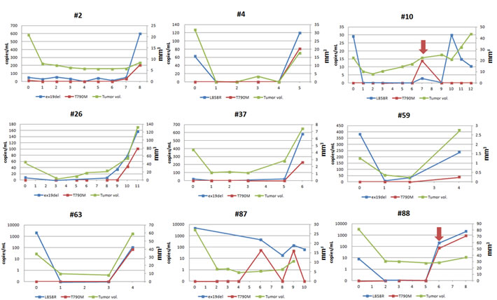 Figure 4: Longitudinal L858R, ex19del and T790M levels in plasma along with tumor volume measured by CT scan. Arrow (red) shows increased copy number of both plasma L858R and T790M before RECIST-defined progression in two patients (#10 and #88). (Unit of x-axis: time point of acquisition of plasma (every 8 weeks). 0 = baseline).