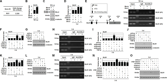 Figure 1: TGF-β and Wnt3a induces GLS1 expression by Dlx-2 activation. A-C. MCF-7 cells were transfected with Dlx-2. Changes in cellular gene transcription were detected by microarray analysis (A). Fold increases in expression as compared with Mock are shown. The cells were also analyzed by real-time qrtPCR (B) and immunoblotting (C) using the indicated primers and antibodies. **p < 0.01 versus Mock. D. MCF-7 cells co-transfected with Dlx-2 and shSnail were analyzed by real-time qrtPCR for GLS1 expression. **p < 0.01 versus Mock. E. A schematic diagram of the human GLS1 promoter regions is shown in left panel, and the 4 predicted Dlx-2 binding sites are indicated by black boxes and numbered D1, D2, D3 and D4. The ChIP-enriched DNA was amplified using primers #1, #2 or #3, which encompass the D1/D2, D3, or D4 binding sites in the GLS1 promoter, respectively. MCF-7 cells were transfected with Dlx-2 and analyzed using ChIP assays (right panel). F, G. MCF-7 cells transfected with shDlx-2 or shSnail and then treated with TGF-β were analyzed by real-time qrtPCR (F) and immunoblotting (G) for GLS1 expression. **p < 0.01 versus untreated, ##p < 0.01 versus shCon. H. MCF-7 cells were treated with TGF-β and analyzed using ChIP assays. I, J. MCF-7 cells were transfected with shRNA for Smad 2/3/4 and then treated with TGF-β. The cells were then analyzed by real-time qrtPCR (I) and immunoblotting (J) for GLS1 expression. **p < 0.01 versus untreated, ##p < 0.01 versus shCon. K, L. MCF-7 cells transfected with shDlx-2 or shSnail and then treated with Wnt3a CM were analyzed by real-time qrtPCR (K) and immunoblotting (L) for GLS1 expression. **p < 0.01 versus untreated, ##p < 0.01 versus shCon. M. MCF-7 cells were treated with Wnt3a CM and analyzed using ChIP assays. N, O. MCF-7 cells were transfected with shRNA for β-catenin, TCF4, and Axin1/2 and then treated with Wnt3a CM. The cells were then analyzed by real-time qrtPCR (N) and immunoblotting (O) for GLS1 expression. **p < 0.01 versus untreated, ##p < 0.01 versus shCon. All error bars represent SE. For all immunoblotting images, cropped blots are shown.