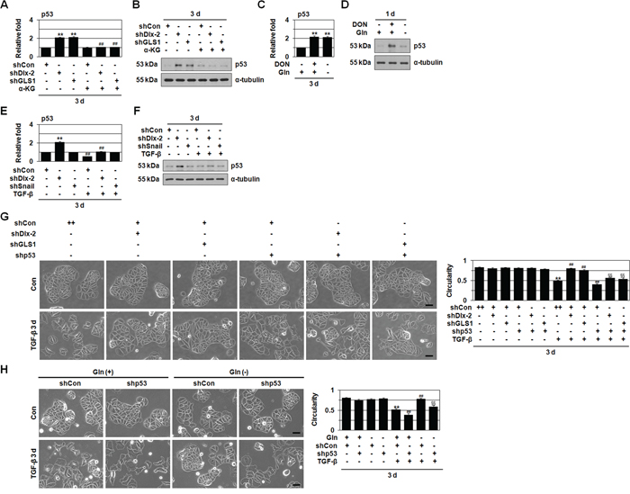 Figure 4: shDlx-2 or Gln metabolism inhibition increase the expression of p53. A, B. MCF-7 cells transfected with shDlx-2 or shGLS1 and then treated with α-KG were analyzed by real-time qrtPCR (A) and immunoblotting (B) for p53 expression. **p < 0.01 versus shCon, ##p < 0.01 versus untreated. C, D. MCF-7 cells treated with DON or cultured in Gln-free medium were analyzed by real-time qrtPCR (C) and immunoblotting (D) for p53 expression. **p < 0.01 versus control. E, F. MCF-7 cells transfected with shDlx-2 or shSnail and then treated with TGF-β were analyzed by real-time qrtPCR (E) and immunoblotting (F) for p53 expression. **p < 0.01 versus shCon, ##p < 0.01 versus untreated. G. MCF-7 cells co-transfected with shDlx-2 or shGLS1 and shp53 and then treated with TGF-β were analyzed by phase-contrast microscopy for cell morphology (left) and circularity (right). The borders (white) drawn along the cell edges are shown for quantification of circularity. The results (54-158 cells in each group) are presented as mean ± SE. **p < 0.01 versus untreated, ##p < 0.01 versus shCon with TGF-β, §§p < 0.01 versus shDlx-2 or shGLS1 with TGF-β. H. MCF-7 cells transfected with shp53 and then cultured in complete or Gln-free medium with TGF-β were analyzed by phase-contrast microscopy for cell morphology (left) and circularity (right). The borders (white) drawn along the cell edges are shown for quantification of circularity. The results (26-134 cells in each group) are presented as mean ± SE. **p < 0.01 versus untreated, ##p < 0.01 versus complete medium with TGF-β, §§p < 0.01 versus shCon in Gln-free medium with TGF-β. All error bars represent SE. All scale bars represent 100 μm. For all immunoblotting images, cropped blots are shown.