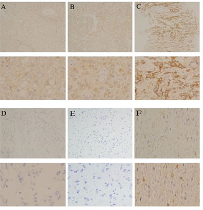 Figure 1: The expression pattern of PD-L1 in gliomas. A. Weak expression of PD-L1 was shown in a glioma case (100×), B. Moderate expression of PD-L1 was shown in a glioma case (100×), C. Strong expression of PD-L1 was shown in a glioma case (100×), D. Negative expression of PD-L1 was shown in a glioma case (100 ×), E. Negative expression of PD-L1 was shown in normal brain tissue (100 ×), and F. 5% positive expression of PD-L1 was shown in a glioma case (100 ×) The lower panels indicated the higher magnification (200×) from the upper panels.