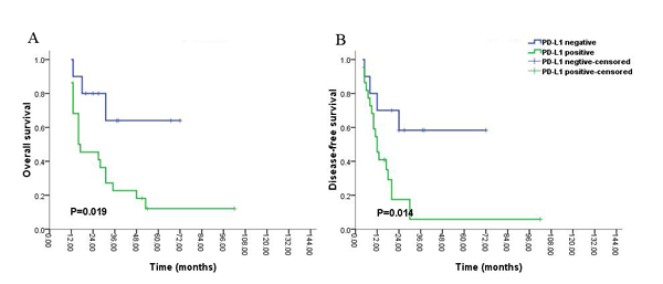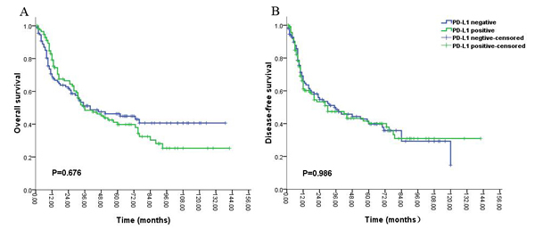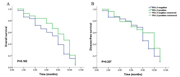 Figure 5: Kaplan-Meier survival analysis of PD-L1 expression and the prognosis including overall survival (A) and disease-free survival (B) for all the patients with glioblastoma (grade IV) during long-time survival or follow up.