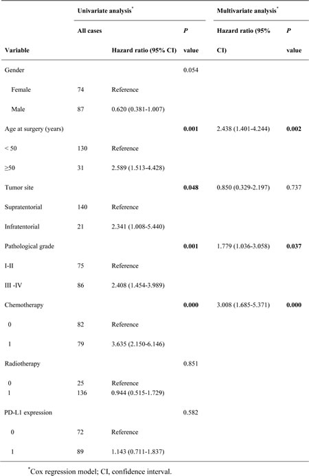 Univariate analysis showed that PD-L1 expression was not significantly correlated with OS (median OS; 36 months vs. 40 months, P = 0.676, Figure 2A) and DFS (median DFS; 75 months vs. 70 months, P = 0.988, Figure 2B) in 229 patients. According to the median survival time of 12 months for patients with glioblastoma (grade IV) in published previous studies, we divided the 229 patients into two groups including the group of short-time survival or follow up (OS < 12 months) and that of long-time survival or follow up (OS ≥ 12 months). For the group of patients with short-time survival or follow up, clinicopathological prognostic factors, (i.e. gender, tumor site, age, pathological grade, chemotherapy after surgery, radiotherapy after surgery and PD-L1 expression) were not inversely associated with OS and DFS (P > 0.05). A strong tendency towards the statistical significance was demonstrated between PD-L1 expression and better prognosis in the patients with the short-time survival or follow up (P = 0.162, Figure 4A). While the partial prognostic factors was closely linked with OS and DFS (P < 0.05, Tables 2 and 3) including tumor site, age, pathological grade, chemotherapy after surgery for the patients with long-time survival or follow up. Meanwhile, PD-L1 expression had a significant impact on the poor OS (P = 0.020, Table 2 and Figure 3A), but was not associated with DFS (P = 0.582, Table 3 and Figure 3B) in patients with long-time survival or follow up. PD-L1 expression and other clinicopathological features which were significant in univariate analysis were re-analyzed in multivariate analysis, including tumor site, age, pathological grade, chemotherapy after surgery and PD-L1 expression (Tables 2 and 3). Survival assessment revealed that PD-L1 expression was not correlated with poor OS (Cox regression model, hazard ratio: 1.536, 95% CI: 0.949-2.488, P = 0.081, Table 2), suggesting a strong tendency towards statistical significance between PD-L1 expression and adverse OS. However, age and pathological grade was served as independent prognostic predictors for OS and DFS (P < 0.05, Table 2 and 3).