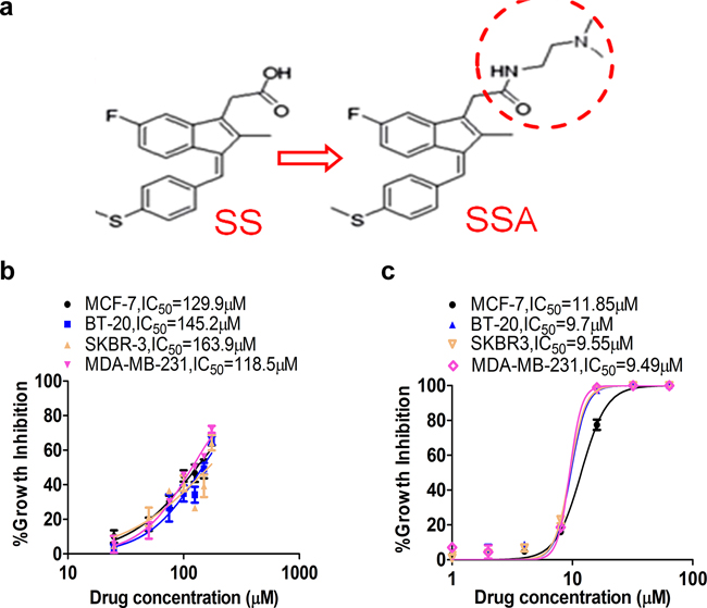 Figure 1: SSA shows greater potency to inhibit breast cancer cell growth compared to SS. a. The chemical structure schemes of SS and SSA. b. Breast cancer MCF-7, MDA-MB-231, BT-20, and SKBR-3 cells were treated with SS at 25, 50, 75, 100, 125, 150, and 175 μM for 36 h. c. Breast cancer MCF-7, MDA-MB-231, BT-20, and SKBR-3 cells were treated with SSA at 1, 2, 4, 8, 16, 32, and 64 μM for 36 h. Cell growth inhibitory activity was evaluated by using Cell Titer-Glo Assay, which measures viable cell numbers based on ATP content. The relative cell viability was computed and the growth inhibition curve was plotted in which IC50 was calculated by using GraphPad Prism 6.