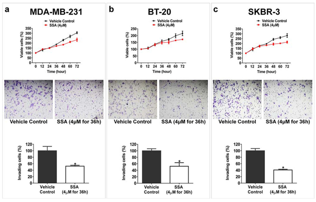 Figure 2: SSA inhibits breast tumor cell invasion at a sub-cytotoxic condition. Upper panels: a. MDA-MB-231, b. BT-20, and c. SKBR-3 cells were treated with 4 μM SSA at different time points; the viability of these cells were not significantly affected prior to 36 h (P > 0.05). Middle panels: The inhibitory effect of SSA (4 μM for 36 h) on invasion of (a) MDA-MB-231, (b) BT-20, and (c) SKBR-3 cells were evaluated by using BD Matrigel invasion assay. After removing the non-invading cells with a clean cotton swab, the invading cells were fixed with formaldehyde and then stained with crystal violet before counting. Bottom panels: Quantification analyses of SSA inhibitory effect on breast tumor cell invasion. Five microscopic fields randomly chosen from each assay were counted individually, and the statistical significance between SSA treatment and the vehicle control was determined by t-test (*P < 0.05).