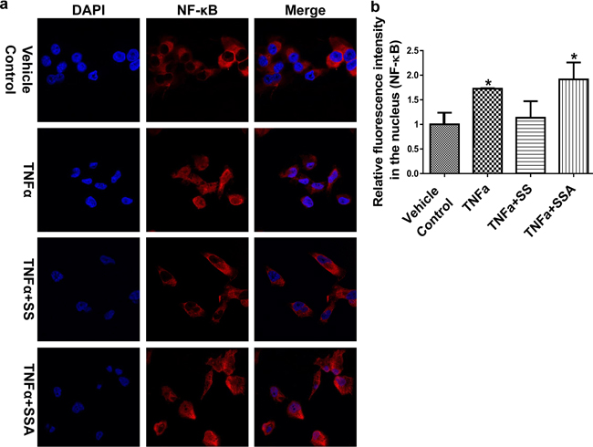 Figure 3: SSA does not influence the nuclear translocation of NF-κB in MDA-MB-231 cells. a. The immunofluorescence imaging results show that SS can block NF-κB to enter the nucleus by attenuating TNFα simulative effect in MDA-MB-231 cells, but SSA doesn’t. The treatments include the vehicle control (0.1% DMSO), TNFα (25 ng/ml), TNFα+SS (50 μM), and TNFα+ SSA (4 μM). Red: NF-κB antibody; Blue: DAPI. Images were captured by using Nikon Eclipse Ti Laser Confocal Scanning Microscopy.b. Quantitative analysis of NF-κB in the nucleus. The relative fluorescent intensity of NF-κB was analyzed by using NIS-Elements AR imaging software. Data are presented as the mean of thirty measurements ± standard deviation. *P < 0.05.