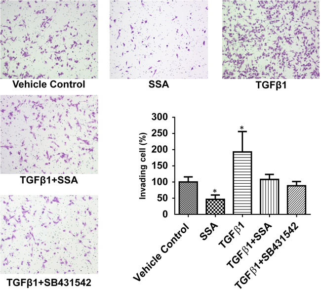 Figure 4: SSA attenuates the inductive effect of TGFβ1 on invasion of MDA-MB-231 cells. BD Matrigel invasion assay was used to evaluate the motility of MDA-MB-231 cells with different treatments including the vehicle control (0.1% DMSO), SSA (4 μM), TGFβ1 (30 ng/ml), TGFβ1+SSA, and TGFβ1+SB431542 (TGFβ1 receptor inhibitors, 10 μM). Five microscopic fields randomly chosen from each assay were counted individually, and the statistical significance between different treatments and vehicle control was determined by t-test. *P < 0.05.