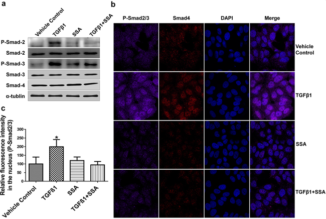 To further define the mechanism by which SSA inhibits TGFβ signaling, the phosphorylation of Smad2 and Smad3 was measured in MCF-7 breast tumor cells following the treatment with TGFβ1. The translocation and accumulation of the complex of phospho (p)-Smad2/3 and Smad4 in nucleus are key events for transduction of TGFβ receptor-mediated signaling [25]. As shown in Figure 6a, SSA significantly reduced the phosphorylation of Smad2 and Smad3, and attenuated the inductive effect of TGFβ1 treatment without interruption of the expression of total Smad2, Smad3, and Smad4. In addition, the expression levels of p-Smad2, p-Smad3, and Smad4 in the nucleus of MCF-7 breast tumor cells were measured by immunofluorescence microscopy, and we found that SSA could reduce the level of p-Smad2/3 in the nucleus with or without the presence of TGFβ1(Figure 6b). These results suggest that the mechanism by which SSA inhibits TGFβ signaling involves inhibition of Smad2 and Smad3 phosphorylation.