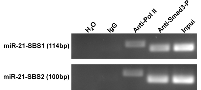 We next used a ChIP assay to determine the regulation of miR-21 expression by TGFβ. In the promoter of miR-21, we identified two binding sites of p-Smad3, SBS1 (ATGCATTCT) and SBS2 (AAGTCAGAGAG), as reported previously [30, 31]. Then, the sheared chromatin from MCF-7 cells pretreated with TGFβ1 was precipitated by using anti-phosphorylated Smad3 antibody. After isolated DNA fragments from the pull-down complex, we performed PCR to amplify the target fragments including SBS1 and SBS2 sequences. As shown in Figure 8, the expected bands were found, demonstrating that the DNA fragments immunoprecipitated by the anti-phosphorylated Smad3 antibody contain the promoter sequences of miR-21.