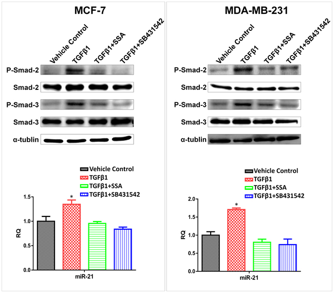To further study the interaction between SSA and TGFβ signaling in regulation of miR-21 expression, MCF-7 and MDA-MB-231 breast tumor cells were treated with 4 μM SSA, 30 ng/ml TGFβ1, and their combination, respectively. The TGFβ1 receptor inhibitor, SB431542 was included as the control. As shown in Figure 9, TGFβ1 treatment induced the phosphorylation of Smad2/3, which in turn, led to upregulation of miR-21 in both breast tumor cell lines; whereas SSA reduced miR-21 expression through inhibition of Smad2/3 phosphorylation. SB431542 showed a similar phenotype to SSA, which demonstrates the direct inhibition of Smad2/3 phosphorylation by SSA. These results show that the transcriptional regulation of TGFβ on miR-21 expression depends on the direct binding of p-Smad2/3 to the promoter regions of miR-21.