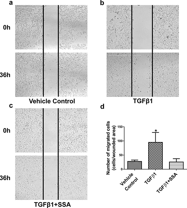 Each 2 × 105 cells were seeded in a single well of 6-well plates and cultured until near confluence (85-95%). After serum starvation for 24 h, a sharp pipette tip was used to scrape a straight line in the middle of the well and the floated cells were washed away with warm PBS. Then the cells are maintained at 37°C for observation of migration. For SSA mediated effects, cells were treated with 4 μM SSA, 30 ng/ml TGFβ1, vehicle control (0.1% DMSO) or incubated simultaneously with 30 ng/ml TGFβ1 and 4 μM SSA for 36 h. The cell migration imaging was photographed at 0, 12, 24, 36 h using EVOS® FL Cell imaging System (Fisher Scientific, Pittsburg, PA) after scraping. Migrating cells in the wound area were counted for quantification. Data are presented as the average number of migrating cells ± standard deviation in three independent experiments.