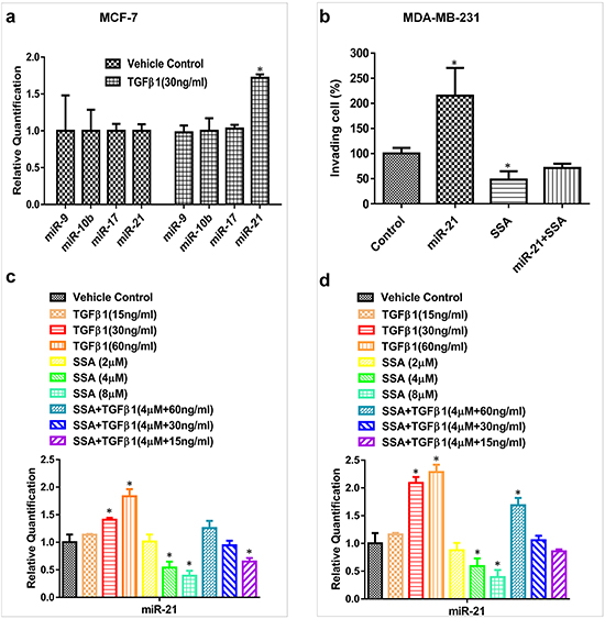 Figure 7: SSA regulates miR-21 expression through the blockade of TGFβ signaling. a. TGFβ1 at 30 ng/ml can induce miR-21 but not miR-10b, 17, and -9 expressions in MCF-7 cells as measured by qRT-PCR. b. SSA at 4 μM can inhibit the cell invasion induced by miR-21 mimics in MDA-MB-231 cells. BD Matrigel invasion assay was used to quantitate the motility of MDA-MB-231 cells in which the vehicle control or miR-21 mimics were transiently transfected. The transfected cells were also treated with SSA at 4 μM to observe its inhibitory effect on the invasive phenotype induced by miR-21. c. The combinations of SSA and TGFβ1 at different concentrations can alter the expression of miR-21 variably in MCF-7 cells as evaluated by qRT-PCR. d. The combinations of SSA and TGFβ1 at different concentrations can alter the expression of miR-21 variably in MDA-MB-231 cells as evaluated by qRT-PCR. *P < 0.05.