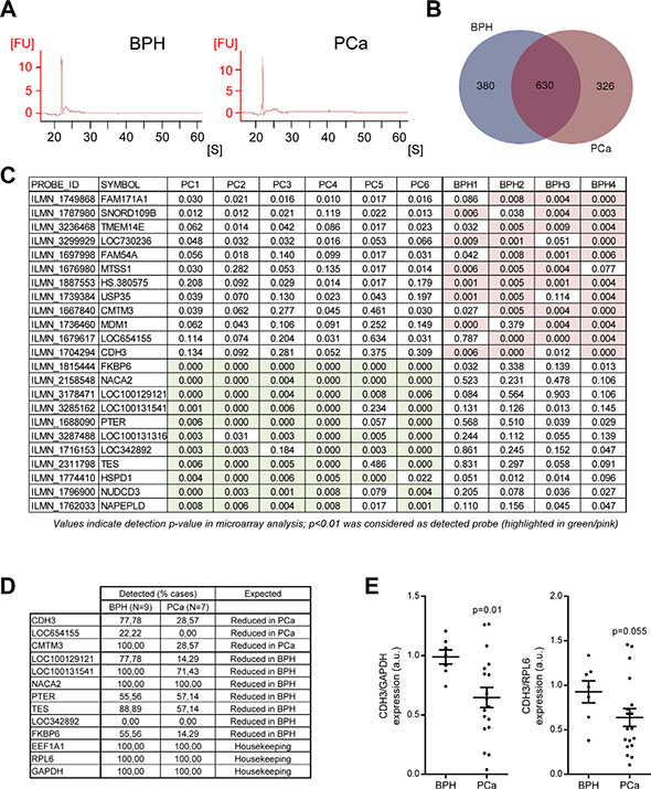 Figure 2: Transcriptomic analysis of uEVs reveals transcripts with differential abundance in BPH and PCa. (A) Representative analysis of RNA size distribution obtained from the Bioanalyzer analysis of uEV preparations. n = 4–6. (B) Venn diagram depicting the number of unique transcripts identified in each experimental condition (n = 4 for BPH and n = 6 for PCa). (C) Transcripts exhibiting a presence-absence pattern in BPH and PCa. The transcripts shown complied with the requirements of being absent in one condition and with a minimum presence of 75% of cases in the other. Detection p-value is presented, where a limit was established in p < 0.01 in the microarray analysis (significant conditions are highlighted in pink or green in BPH and PCa, respectively). (D) Detection of ultracentrifugation-purified candidate uEV transcripts by qRTPCR. Detection was established as consistent amplification in the technical settings employed in the assay. n = 7 for BPH and n = 9 for PCa. (E) Transcript abundance of CDH3 relative to GADPH (left) and RPL6 (right) in Norgen-purified uEVs-associated RNA samples. n = 6–7 for BPH and n = 18 for PCa. FU: fluorescence units. S: seconds. Error bar represents s.e.m. a.u. = Arbitrary units. Statistic test: Mann Whitney U test (E).