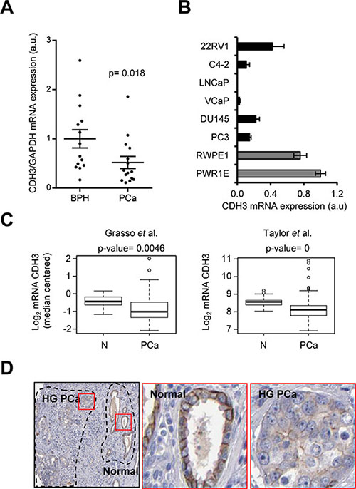 Figure 3: CDH3 expression is reduced in PCa specimens. (A) CDH3 expression in tissue biopsies from BPH and PCa. CDH3 expression relative to GAPDH is shown. n = 14 for BPH and n = 15 for PCa. (B) CDH3 expression in a panel of metastatic prostate cancer cell lines (black bars) and benign immortalized prostate cell lines (grey bars) relative to beta-Actin. n = 3. (C) CDH3 expression in two PCa datasets (Taylor PCa n = 150, normal n = 29; Grasso PCa n = 76, normal n = 12). (D) Representative images of immunohistochemical detection of CDH3 protein in PCa. Middle panel corresponds to a normal area and right panel to high grade PCa (HG PCa). Data source: Human Protein Atlas. Statistic test: Mann Whitney U test (A), Student t test (C).