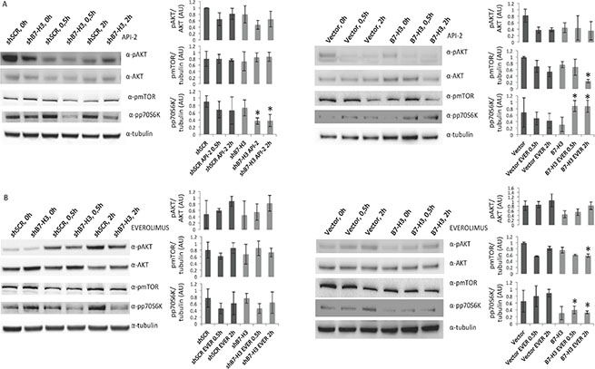 Figure 4: Immunoblot analysis of AKT, mTOR and p70S6K activation in MDA-MB-231 cell variants treated or not with API-2 and everolimus. Immunoblot of phospho AKT (pAKT), AKT, phospho-mTOR (pmTOR), phospho-p70S6K (pp70S6K) and tubulin expression from total lysates from (A) MDA-MB-231 control (shSCR) and knockdown B7-H3 (shB7-H3) cells (left panels), Vector control and B7-H3 overexpressing cells (right panels) treated or not with 2 μM API-2 for 0,5 h and 2 h. (B) MDA-MB-231 shSCR and shB7-H3 cells (left panels) and Vector and B7-H3 cells (right panels) treated or not with 200 nM everolimus for 0, 5 h and 2 h. Plots show quantified immunoblot bands from pAKT/AKT, pmTOR/tubulin and pp70S6K/tubulin, in arbitrary units (AU) ± S.D. Significant changes are shown with *p < 0.01. In all experiments (A and B) DMSO was used as a vehicle control.