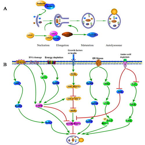 A series of signaling pathways have been implicated in autophagic process during cancer initiation and development. The central checkpoints in autophagy induction are the phosphatidylinositol 3-kinase (PI3K)/mammalian target of rapamycin (mTOR) and AMP activated protein kinase (AMPK) signaling pathways (Figure 1B) [6, 7]. Activated the class I PI3K generates phosphatidylinositol-3, 4, 5-triphosphate, which binds to the pleckstrin homology domain of Akt and PDK1 at the plasma membrane. As a result, Akt signaling pathway is activated. Once activated, Akt may stimulate multiple downstream targets, including the mTOR pathway which negatively regulates autophagy [8]. Conversely, AMPK, the primary energy-sensing kinase of the cell which is activated during hypoxia or energy depletion by increased ratios of AMP to ATP, can stimulate autophagy through mTOR in a TSC1/2 dependent pathway [9, 10]. In addition, endoplasmic reticulum (ER) stress may induce autophagy through the PERK-eukaryotic initiation factor 2α (eIF2α)-AEF4 and IRE1-JNK1 pathways [11, 12]. Hypoxia promotes the activation of autophagy through upregulation of BNIP3 [13]. Rag and Raf/MEK/ERK signaling pathways contribute to amino acid depletion induced autophagy [14]. DNA damage and energy depletion also respectively stimulate autophagy via p53 or LKB1 signal, the upstream target of mTOR.