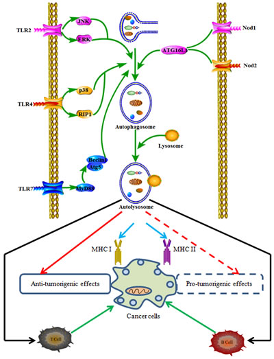 Figure 2: The relationship between autophagy-associated immune signals and cancer immune responses. Activation of innate and adaptive receptors can regulate autophagy through different signaling pathways and act in the recruitment of autophagy proteins to phagosomal membrane, resulting in anti-tumorigenic effects or pro-tumorigenic effects.