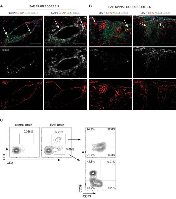 Autoantigen specific activation of CD4 cells is used to induce EAE in mice. This experimental model fairly reproduces neuroinflammation determined by pathogenic T cell activation in multiple sclerosis (MS). Confocal analysis of brain and spinal cord from EAE mice revealed infiltrating CD3+ T cells around blood vessels (Figure 1A) and in the spinal cord (Figure 1B) that were positive for both CD39 and CD73 ectoenzymes in the plasma membrane. Interestingly, CD39 or CD73 positive T cells were in direct contact with astrocytes as indicated by triple labeling for the astrocyte marker glial fibrillary acidic protein (GFAP) (arrows in Figure 1A, 1B). Ex vivo analysis of brain from mice with EAE in flow cytometry confirmed the presence of CD39+CD73+ double positive cells within the CD4+ subset and a population of CD39+ cells within the CD3+CD4- compartment infiltrating the brain that were absent in healthy animals (Figure 1C).