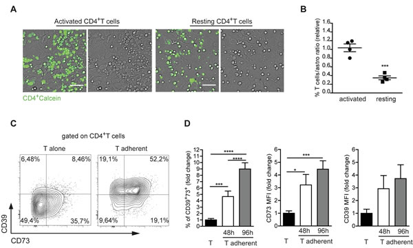 Figure 2: Astrocytes promote CD39 and CD73 expression in recently activated CD4 cells. A. Co-cultures of CD4+ T cells loaded with calcein-AM (green) with purified astrocytes. Activated T cells massively adhered to astrocytes 48 h after plating, acquiring a flat shape (left), while resting (unstimulated) T cells remained suspended over the astrocyte monolayer (right). Scale bar 50 µm. B. Statistical analysis of resting vs activated T cells to astrocytes ratio after accutase treatment at 48h of co-culture. Student T test, ***p < 0.001. C. Representative dot plot of CD39 and CD73 expression in activated CD4+ T cells after 48 h of culture in isolation or adherent to astrocytes. D. Fold change in percentage of CD39+73+ T cells adherent to astrocytes, CD73 and CD39 MFIs after 48h (white) and 96h (grey) co-culture. Values were normalized to T cells alone (black). One-way ANOVA; Bonferroni’s test for comparison among groups, *p < 0.05 ***p < 0.001, ****p < 0.0001; N > 6.