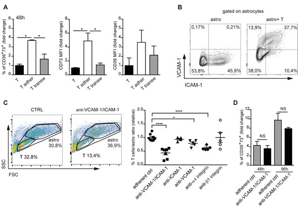 Adhesion to astrocytes is required for upregulation of CD39 and CD73 in T cells