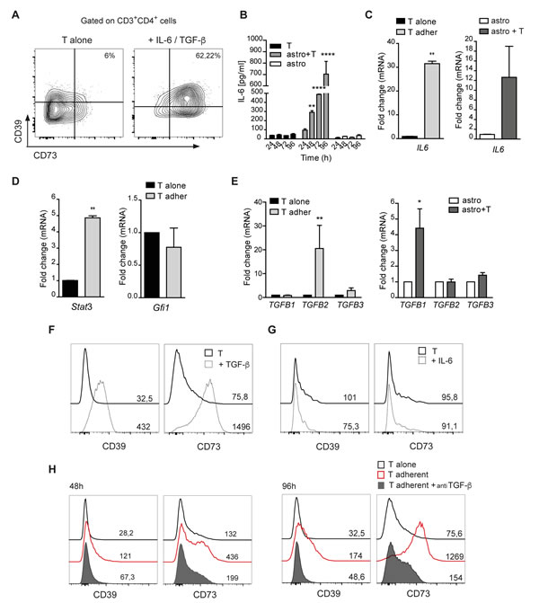 Figure 6: TGF-β promotes CD39 and CD73 upregulation in T cells. A. FACS analysis for plasma membrane CD39 and CD73 in naive CD4+ T cells stimulated for 96 h with anti-CD3/CD28 mabs in the presence of TGF-β and IL-6. B. Quantification of IL-6 by ELISA in the supernatant of T cells, astrocytes and astrocyte/T cell co-culture. Two-way ANOVA; Bonferroni’s test for comparison among groups, **p < 0.01, ****p < 0.0001; N = 3. C. IL6 mRNA levels in purified T cells (left) or astrocytes (right) after 48 h of co-culture. Mann-Whitney’s test , **p < 0.01; N = 3. D. Real-time qRT-PCR for Stat3 and Gfi1 in T cells alone and CD39+73+ T cells adherent to astrocytes. Mann-Whitney’s test; **p < 0.01; N = 3. E. Expression of TGFB1, TGFB2, TGFB3 assessed by qRT-PCR in T cells (left) (N = 4) or astrocytes (right) (N = 2) alone or co-cultured for 48 h. Mann-Whitney’s test; *p < 0.05; ***p < 0.01. F.,G. FACS analysis of CD39 and CD73 expression with MFIs indicated, in CD3/CD28 stimulated CD4 cells (black line), with addition of TGF-β (F) or IL-6 (G) (dashed line) for 96 h. H. CD39 and CD73 expression (MFIs) on CD4+ T cells cultured alone (black line) or pre-incubated (filled grey) or not (red) with TGF-β RI kinase inhibitor VI before co-culturing with astrocytes for 48 and 96 h.