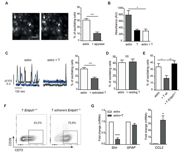 Figure 7: CD39 mediated inhibition of spontaneous cytosolic Ca2+ oscillations in astrocytes by recently activated CD4 cells. A. Representative fluorescence images of astrocytes loaded with Oregon green showing spontaneous calcium oscillations (left, arrows) and statistical analysis of astrocytes showing calcium oscillations in control culture (astro) or with addition of apyrase. Mann-Whitney’s test; ****p < 0.0001; N = 3. B. Luciferin/luciferase assay for extracellular ATP concentration in medium from astrocyte or T cell cultures, or astrocyte/T cell co-cultures (after 72 h). Means of triplicates ± SEM from a representative experiment are shown. One-way ANOVA; Bonferroni’s test for comparison among astrocytes cultured alone and astrocytes in co-culture with T cells; *p < 0.05. C. Temporal analysis of cytosolic Ca2+ concentration recorded from three representative astrocytes cultured alone (left) or co-cultured with activated T cells for 96 h (right) and statistical analysis of astrocytes showing spontaneous calcium oscillations. Mann-Whitney’s test; ****p < 0.0001, N = 6. D. Same analysis as in C but with resting T cells. Student’s t-test, NS = not significant; N = 2. E. Same analysis as in C with activated T cells from wild-type and Entpd1-/- mice. One-way ANOVA; Bonferroni’s test for comparison among groups; *p < 0.05; **p < 0.01; N = 3. F. FACS analysis of CD39 and CD73 expression in activated Entpd1-/- T cells either cultured alone or adhering to astrocytes after 48 h co-culture. G. Real-time qRT-PCR for CCL2, GFAP and Shh in astrocytes either cultured alone or co-cultured with activated T cells (at 48 h). Mann-Whitney’s test, **p < 0.01, ****p < 0.0001; N = 4.