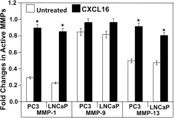 Figure 3: CXCL16 induced active MMP expression by PC3 and LNCaP cells. Cells were cultured for 24 h with (