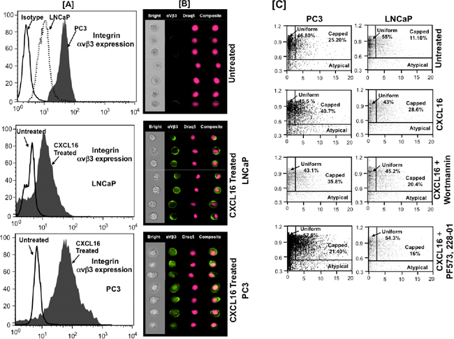 Figure 5: CXCR6-CXCL16 induced αvβ3 integrin clustering in PCa cells. Panel-A. Expression of integrin αvβ3 in PCa cell lines. Untreated or CXCL16 treated PCa cells stained for integrin αvβ3 and nucleus stained with Draq5. Panel-B. Quantitative analysis of CXCL16 induced integrin αvβ3 clustering using ImageStream100 image based flow cytometer. Bright field (white), Integrin αvβ3 (green) and Draq5 (red), composite images for representative PC3 and LNCaP cells are shown. Panel-C. Percentage of cells showing αvβ3 integrin clustering in response to CXCL16 treatment with or without PKC/FAK inhibition. Integrin clustering was quantified using two standard image-based software analysis features: Area aspect ratio and Radial delta centroid, which demonstrated three types of cell population in samples: Uniform (global distribution of integrin αvβ3 on cell surface; cells with high aspect ratio with low radial delta centroid values), Capped (integrin αvβ3 clustered in a specific cell area; cells with high aspect ratio values and relatively low radial delta centroid) and Atypical (cell debris; cells with smaller aspect ratio and low radial delta centroid).