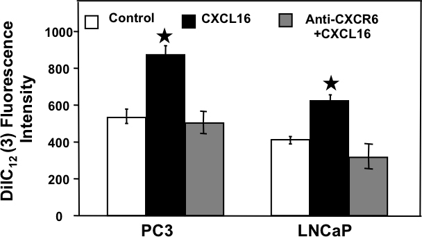 ). Asterisk (*) indicates significant differences (p < 0.05) between no additions and CXCL16-treated cells. Panel-B. CXCR6-mediated PCa cell invasion. PCa and RWPE-1 cells were tested for their ability to invade or translocate across a Matrigel matrix in response to chemotactic gradients with (