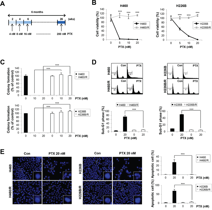 Figure 1: Establishment of PTX resistant cell lines. A. Schedules for the creation of PTX resistant cell lines. Cells were treated with PTX at concentrations from 4 nM to 200 nM in a dose-escalating manner for 6 months. B. H460, H460/R, H226B, and H226B/R cells were treated with PTX in a dose-dependent manner for 72 h. Cell viability was evaluated using the trypan blue exclusion assay. C. Cells were grown for 10 days in medium containing 20 nM PTX. Anchorage-dependent colony formation was assessed by counting the individual colonies using Motic images plus 2.0 software. D. Cells were treated with 20 nM PTX for 72 h and incubated with PI solution for DNA content-based assessments of cell cycle distribution. The cell population in the sub-G1 phase was delineated as apoptotic cells. E. Fluorescence microscopy of DAPI-stained cells treated for 48 h with PTX (20 nM). Apoptotic cells were identified by highly condensed and fragmented nuclear DNA. The data are presented as the mean ± SD. The statistical significance was analyzed using Student’s t-test (*** P < 0.001 vs. the respective control).
