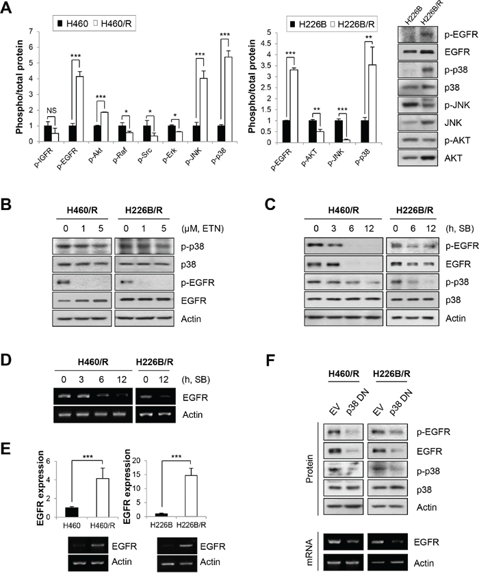 Figure 2: p-p38 MAPK and p-EGFR are up-regulated in PTX resistant cell lines. A. The activities of signaling molecules related to cancer cell survival and the development of drug resistance were investigated in parental cells and PTX resistant cells. Activities were estimated by calculating the ratio between phosphorylation and total protein levels based on the band intensity of at least three immunoblots using ImageJ software (National Institutes of Health freeware). The right panel exhibits the representative immunoblots of H226B and H226B/R cells. The data are presented as the mean ± SD. The statistical significance was analyzed using Student’s t-test (NS = not significant, * P < 0.05, ** P < 0.01, *** P < 0.001 vs. the respective control). B. H460/R and H226B/R cells were incubated with erlotinib (ETN) at the indicated concentrations for 24 h. The expressions of p-p38, p-EGFR and their total proteins were analyzed using western blot analysis. (C and D) H460/R and H226B/R cells were treated with SB203580 (SB; 50 μM) at the indicated time points. C. The expression of p-EGFR, p-p38 and their total proteins were analyzed using western blot analysis. D. The mRNA level of EGFR was determined using RT-PCR. E. The basal expression levels of EGFR mRNA between parental cells and PTX resistant cells were detected using RT-PCR (lower) and confirmed by quantitative RT-PCR (upper). The data are presented as the mean ± SD. The statistical significance was analyzed using Student’s t-test (*** P < 0.001 vs. the respective control). F. H460/R and H226B/R cells were stably transfected with a dominant-negative mutant of p38 MAPK (p38 DN). Western blot analysis was performed to investigate the expression changes of p-EGFR and EGFR following the transfection of inactive p38 MAPK (upper). RT-PCR was also conducted to verify the influence of p38 MAPK on the expression of EGFR mRNA (lower).