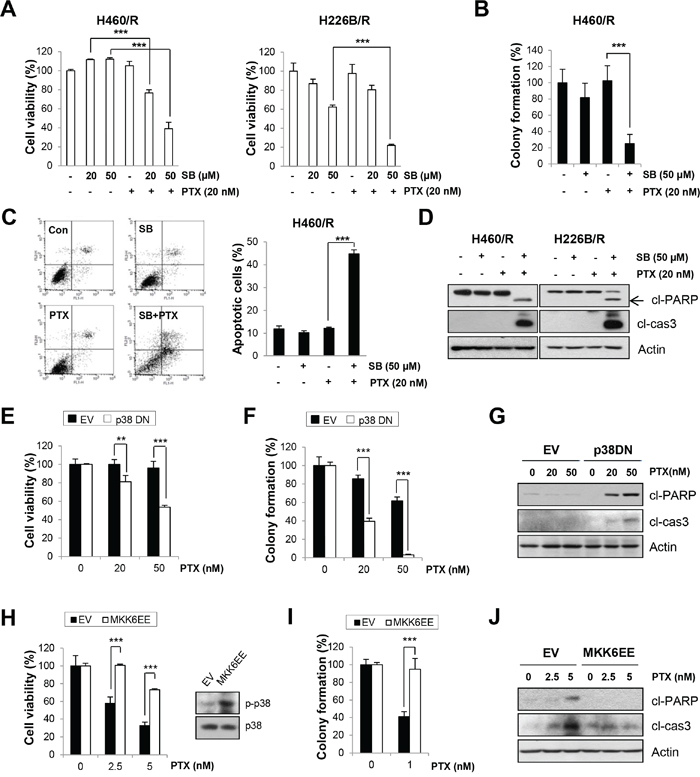 Figure 3: The activity of p38 MAPK determines PTX resistance. A. H460/R and 226B/R cells were treated with PTX (20 nM) w/ or w/o SB203580 (SB; 20 or 50 μM) for 72 h. Cell viability was determined by the MTT assay. B. For the anchorage-independent colony formation assay, a small number of H460/R cells was seeded in 24-well plates and co-treated with PTX (20 nM) and SB203580 (SB; 50 μM) for 10 days. The individual colonies were stained and counted, and the average number of colonies was calculated. C. H460/R cells were treated with PTX (20 nM) in the presence of SB203580 (SB; 50 μM) for 72 h, and annexin V/PI analysis was conducted. Annexin V-positive population was evaluated as apoptotic cells. D. H460/R and 226B/R cells were treated with PTX (20 nM) and SB203580 (SB; 50 μM) for 72 h and then harvested for western blot analysis. E-G. Cells stably transfected with empty (EV) or p38 DN-expression vectors were assessed with (E) the MTT assay to evaluate cell viability following PTX treatment (100 or 200 nM) for 72 h. (F) For the anchorage-dependent colony formation assay, a small number of cells was seeded in 12-well plates and challenged with PTX (20 or 50 nM) for 10 days. G. Western blot analysis was conducted following PTX treatment (50 or 100 nM) for 72 h to evaluate the influence of p38 MAPK on PTX resistance. H-J. Cells stably transfected with empty (EV) or MKK6EE-expression vectors were assessed with (H) the MTT assay following 72 h treatment with PTX (2.5 or 5 nM), (I) the anchorage-dependent colony formation assay after a 10-day treatment with PTX (1 nM), and (J) western blot analysis to detect the expression of apoptotic proteins following PTX treatment (2.5 or 5 nM) for 72 h. The data are presented as mean ± SD. The statistical significance was analyzed using Student’s t-test (** P < 0.01, *** P < 0.001 vs. respective control).