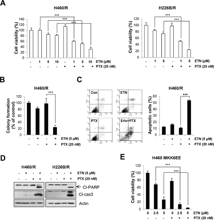 Figure 4: Inhibition of EGFR activity enhances the sensitivity to PTX. A. H460/R and H226B/R cells were treated with erlotinib (ETN) in a dose-dependent manner in the presence of PTX (20 nM) for 72 h. Cell viability was determined by the MTT assay. B. For the anchorage-independent colony formation assay, a small number of H460/R cells were seeded in a 24-well plate and co-treated with PTX (20 nM) and erlotinib (ETN; 5 μM)) for 10 days. The individual colonies were stained and counted, and the average number of colonies was calculated. C. H460/R cells were treated with PTX (20 nM) in the presence of erlotinib (ETN or Erlo; 5 μM) for 72 h, and annexin V/PI analysis was conducted. Annexin V-positive population was evaluated as apoptotic cells. D. H460/R and H226B/R cells were treated with PTX (20 nM) and erlotinib (ETN; 5 μM) for 72 h and then harvested for western blot analysis. E. Cells stably transfected with the MKK6EE-expression vector were challenged with erlotinib (ETN; 2.5 or 5 μM) and PTX (1 nM) for 10 days for the anchorage-dependent colony forming assay. The individual colonies were stained and counted, and the average number of colonies was calculated. The data are presented as the mean ± SD. The statistical significance was analyzed using Student’s t-test (*** P < 0.001 vs. the respective control).
