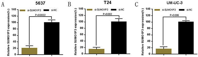 Figure 2: Expression changes of SUMO1P3 after transfection of SUMO1P3 specific siRNA or negative control siRNA. The relative expression level was determined using real-time qPCR. The SUMO1P3 specific siRNA significantly down-regulated the expression level of SUMO1P3 in 5637 A. T24 B. and UM-UC-3 C. cells. Data are shown as mean ± SD.