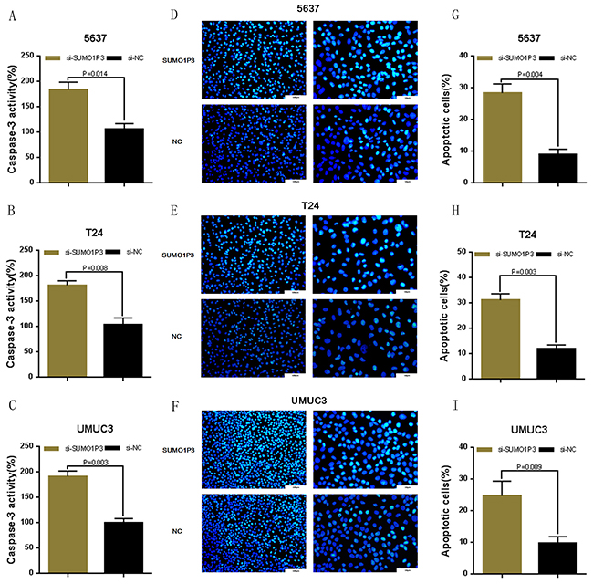 We determined whether SUMO1P3 can inhibit cell apoptosis in bladder cancer. Bladder cancer 5637, T24 and UM-UC-3 cells were transfected with SUMO1P3 siRNA or negative control siRNA. The relative activity of caspase-3 was determined using ELISA assay (Figure 4A, 4B and 4C). Furthermore, the apoptosis ratio in bladder cancer cells was measured using Hoechst 33342 staining and Flow cytometry. Induced cell apoptosis was also observed in 5637 (Figure 4D, 4G and Figure 5A, 5D), T24 (Figure 4E, 4H and Figure 5B, 5E) and UM-UC-3 (Figure 4F, 4I and Figure 5C, 5F) cells. These results demonstrated that SUMO1P3 suppresses cell apoptosis in bladder cancer.