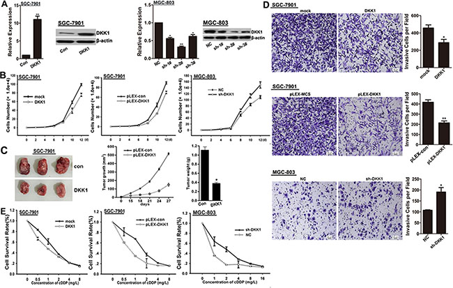 Figure 2: DKK1 impairs proliferation, invasion and chemo-resistance of GC cells. (A) mRNA and protein expression levels of DKK1 were detected in SGC-7901 cells transfected with DKK1 overexpressing plasmid and in MGC-803 cells transfected with shRNAs against DKK1. Finally, sh-#2 was selected for the further experiments. vs related control, *p < 0.05, **p < 0.01. (B) The role of DKK1 on cell proliferation was determined and the average cell number of each time point was indicated. (C) Tumor growth was monitored every 3 days. Tumor size and weight were recorded. Data are represented as a mean ± SD from three mice. vs control, *p < 0. 01. (D) The invasive potential was determined by transwell assay. vs related control, *p < 0.05, **p < 0.01. (E) DKK1 overexpression enhanced the sensitivity of GC cells to cDDP, but DKK1 knockdown attenuated the chemo-sensitivity of GC cells.